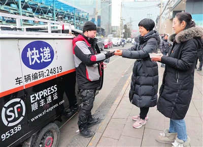 工作人员为快递小哥送上腊八粥。 郑一烁 摄