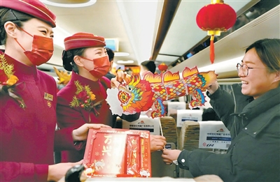 凌晨5时,G6701次列车抵达北京西站12站台。随后,拖着行李的旅客陆续检票乘车。“这趟车变样了!车新了,座席间隔大了,坐着更舒服。”旅客陈先生惊喜地发现,春运首趟高铁充满了节日氛围,车窗上贴着“平安喜乐”窗花,车厢内挂起两排小红灯笼,车上还准备了春运有奖问答活动。
