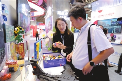 记者在现场了解到,航天益能本次重点展示了“鲲鹏”Y-20、DF-21D反舰弹道导弹等航空航天主题的榫卯积木文创产品。大国重器的形象元素通过榫卯积木展现出来,让尖端的科技视觉化、形象化,让观众直观感受到国之重器的震撼和传统文化的魅力。现场还有包括益智、创意、定制系列等不同主题和风格的明星产品亮相,如鲁班锁、龙、熊猫等,尽显国潮元素。负责人指着展台上的展品说道:“我们致力于将各类IP形象元素注入榫卯拼搭,用极具创意性的产品形态讲述IP故事。本次展会上我们还准备了一些展品,比如庄严古朴的宛平城、创意十足的丰台logo等,希望大家通过榫卯积木展品感受其背后的文化。”
