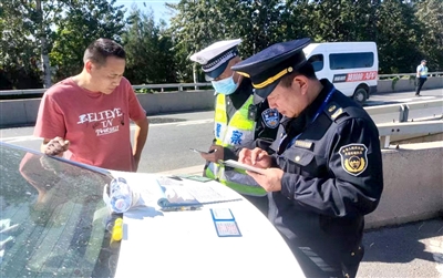 区生态环境局执法人员联合交警开展重型柴油车执法检查。