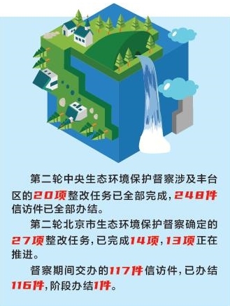 截至目前,第二轮中央生态环境保护督察涉及丰台区的20项整改任务已全部完成,248件信访件已全部办结。第二轮北京市生态环境保护督察确定的27项整改任务,已完成14项,13项正在推进;督察期间交办的117件信访件,已办结116件,阶段办结1件。