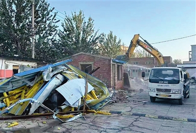 本报讯(特约记者 张宇)近日,丰台区消防救援支队联合街道、公安、城管等部门,对玉泉营街道纪家庙村的两处违建库房进行拆除,两处库房建筑面积共计4500余平方米,后期将结合规划进行地块复绿工作。