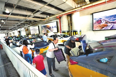 近日,记者在北京南站北枢纽看到,多个并排的公交站台旁多出一条出租车蓄车通道,陆续有旅客来此乘坐出租车。通道内出租车排成两队,旅客基本可实现“即到即走”。这处出租车调度站,正是公交枢纽综合利用的新尝试。