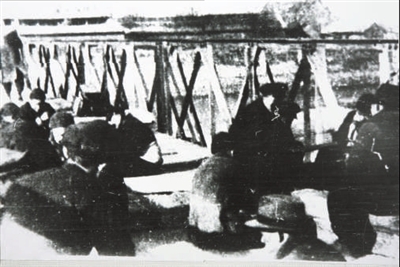 解放后的第二天,工人在解放军的保护下,抢修被敌人撤退时炸毁的卢沟铁路桥。党史办 供图