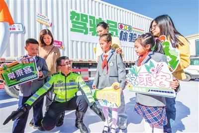 近日,丰台区“文明礼让月”活动正式启动。礼让月期间将重点聚焦行人、乘客、驾驶员三大人群,在重点路口强化文明引导的同时,进一步提出礼让斑马线是安全线,也是礼貌线、文明线。同时,继续推广强化“常乘客”志愿服务,在交通线上筑起一道群防群治的安全出行屏障。图为丰台交通支队丰北大队铁骑交警张日出为小朋友讲解交通规则。原梓峰 摄 (详见07版)