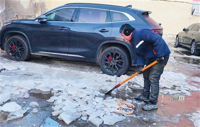 “您好,小区停车场全是冰,我的车轮胎已经冻在地面上了,能过来处理一下吗?”早上,准备出门的李先生发现轮胎冻在了地面上,立即联系社区和物业求助。工作人员赶往现场查看后发现,是管道漏水导致地面结冰,150余平方米的停车场变成了“大冰场”。为不影响居民出行,物业人员先是用热水浇在轮胎周边的冰上,再将冰块敲碎,才使车子可以正常启动。