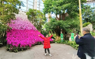 热带植物馆里,兰花展仍在持续,3000余盆兰花群芳争艳。在热带植物馆的中央位置,由2000盆蝴蝶兰组成的国内最大的蝴蝶兰瀑布十分震撼,“瀑布”由白色到深粉色呈渐变排列,独具匠心、蔚为壮观。同时,百年老榕树等各种珍稀植物点缀着卡特兰、文心兰等各种精品洋兰,仿佛一座空中花园,姿态优雅的兰花高低错落盛开在千姿百态的热带植物中,打造了奇妙的植物世界。在精品花卉厅的下沉广场还展出了红花蕙兰、建兰等精品兰花。还有一个个象征着幸福的兰花拱门由500盆兰花装点而成,拍照打卡不容错过。与此同时,温室内的炮仗花正迎来盛花期,一串串形如鞭炮的橘黄色花朵带给游客如意吉祥。此外,热带植物馆、精品花卉厅等地还有年宵花售卖,仙客来、杜鹃花、蝴蝶兰、水仙、文竹……游客也可以在观赏之余选购一盆带回家。