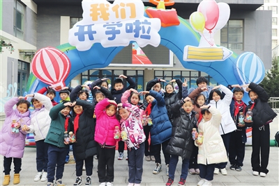 北京十二中附属实验小学开学第一天,孩子们在学校布置的景观前合影。 2月26日,北京市中小学生纷纷迎来春季开学,丰台区各街镇、单位纷纷行动起来,让广大中小学生度过了一个安全、快乐、有意义的开学季。 (详见04版)