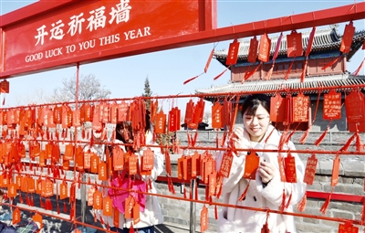 春节是中国人心中最重要的节日,是辞旧迎新的仪式感,更是链接传统与当下的时光通道。2月17日(初八),2024宛平新春嘉年华圆满收官。为期16天、十大板块丰富多彩的游玩体验,为384岁的宛平城带来浓浓新春气氛。图为游客在“开运祈福墙”祈福。原梓峰 摄 (详见03版)