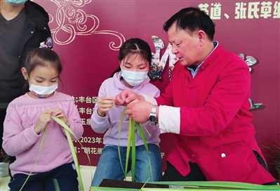 张氏草编非遗传承人张帮寿教小朋友草编。 吕华 摄