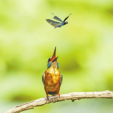 张忙告诉记者:“现在环境好了,翠鸟比较多。因为翠鸟体形比较小,对它的抓拍难度就比较大,但其中的乐趣也多。”谈话间,他从手机里翻出两张拍摄角度相似的翠鸟照片,解释道:“这两张照片都是一瞬间抓拍的,在公鸟觅食回来反哺幼鸟时拍摄的,无论拍摄角度还是动作都十分漂亮。”