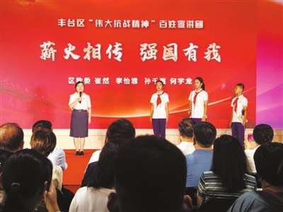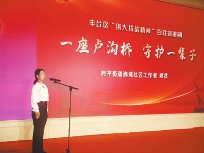 “军人应当马革裹尸,以死报国!”大红门街道干部杨泽云的声音铿锵有力,将抗日英雄佟麟阁将军的壮烈事迹娓娓道来。1937年,佟麟阁率兵死守南苑,面对日军的猛烈进攻,他毫无惧色,始终坚守阵地。“80多年过去,当年的烽火战场早已换了模样。”杨泽云话锋一转,将思绪拉回当下,“如今,南苑所在的南中轴正在加速建设‘首都商务新区’,‘00’后建设者们喊出‘不怕吃苦’的宣言,这和当年佟麟阁将军‘马革裹尸’的精神一脉相承。”杨泽云的话让在场观众深受触动,大家仿佛看到了从抗战烽火到新时代建设的精神传承。