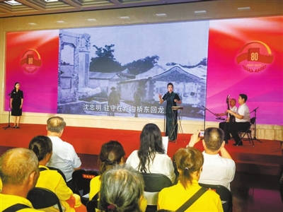 中国人民抗日战争纪念馆讲解员吴雨桐,为大家讲述了中共地下党员沈忠明鲜为人知的英勇故事。1937年7月7日夜,沈忠明率守军卫士,用大刀砍、刺刀扎,与日军展开殊死搏斗,即便身负重伤,仍死死守住阵地,直至牺牲。宣讲过程中,北京曲艺团演员陈娜娜、柴旺里、周春元带来原创西河大鼓《血沃卢沟桥》,配合震撼的视频,沈忠明浴血奋战的场景仿佛就在眼前,观众不禁握紧了拳头,眼中满是敬佩。