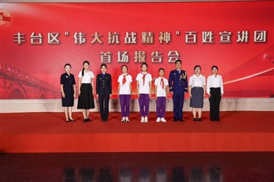 本报讯(记者 蒲长廷 袁阳)铭记抗战历史丰碑,赓续民族精神血脉。为纪念中国人民抗日战争暨世界反法西斯战争胜利80周年,8月25日,丰台区“伟大抗战精神”百姓宣讲团首场报告会在中国人民抗日战争纪念馆拉开帷幕。本次活动由丰台区委宣传部主办。中国戏曲学院党委书记李必友,市社科院副院长、市委讲师团团长肖峻峰,中国人民抗日战争纪念馆馆长罗存康,丰台区委书记王少峰,区委副书记蒋达峰出席。活动现场,丰台区相关部门和基层干部群众代表,文明引导员、志愿者,教师及学生代表等齐聚一堂,聆听抗战故事与英雄事迹,共赴一场跨越时空的“精神之约”。