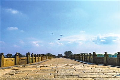 9月3日上午,纪念中国人民抗日战争暨世界反法西斯战争胜利80周年大会在北京天安门广场隆重举行,九三阅兵空中梯队战机起飞,光荣接受检阅。图为受阅战机飞过卢沟桥上空。 摄/裴圣战 (详见06版)