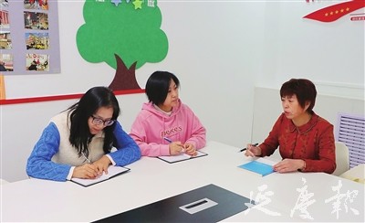 曹玉环(右一)对社区工作人员进行培训 陈宇佳摄