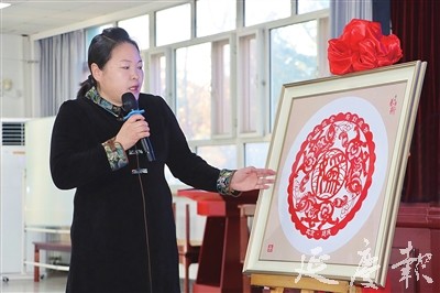 赵海艳介绍“妫水流金马到成功”剪纸作品 张思琦摄