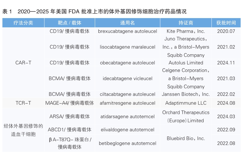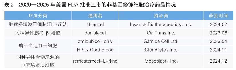 2020—2025年美国食品药品管理局(FDA)批准上市的细胞治疗药品见表1和表2。