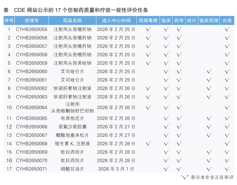 6.CDE网站公示17个仿制药质量和疗效一致性评价任务(详见表),涉及注射用头孢噻肟钠等品种。