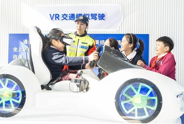 12月1日,江苏省南通市通州区运盐河小学的学生在通州区交通安全教育基地体验VR交通模拟驾驶。