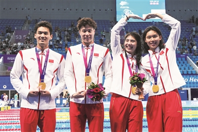 成绩和金牌的背后是顽强拼搏、永不言弃的信念与追求。10月1日,国家羽毛球男队历时306分钟,在大比分0比2落后的情况下,用荡气回肠的方式实现“大逆转”。“00后”运动员李诗沣在落后的情况下,不抛弃、不放弃,《逆战》中开启绝地反击。男双组合刘雨辰/欧烜屹、男单运动员翁泓阳秉持“球不落地,永不放弃”的精神,最终连下两城,卫冕男子团体。无独有偶,游泳名将张雨霏两个月来接连出战福冈游泳世锦赛、成都大运会和杭州亚运会,连续作战让身体承受了巨大负荷。9月28日的比赛中,张雨霏在高烧39度4的情况下依然没有放弃比赛,而是继续战斗,当晚她以改写赛会纪录的方式赢得女子50米自由泳冠军。9月29日,她又在高烧未退的情况下,以打破赛会纪录的成绩夺得女子50米蝶泳金牌,摘取她在杭州亚运会的第六金。张雨霏赛后采访的一段话令人印象深刻,她说:“为了这一届亚运会,我准备了五年,我们国家和那么多人也准备了那么长时间,所以,只要能够坚持,我就一定会继续作战!”