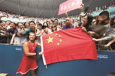 成绩和金牌的背后是祖国至上、为国争光的责任与担当。当国家需要时,多位在国外职业联赛打球的中国运动员毫不犹豫第一时间回国参加亚运会,女子网球单打冠军郑钦文赛后表示“荣誉属于国家”。34岁的铅球奥运冠军巩立姣这次在杭州实现了亚运会三连冠,她表示要在巴黎奥运会上继续为国争光。女子混合泳名将叶诗文时隔9年再战亚运会,为中国队摘得女子200米蛙泳金牌,再度站上最高领奖台注视国旗升起,叶诗文眼圈泛红,引来现场掌声阵阵。女子橄榄球决赛,为了实现升国旗、奏国歌的梦想,带着膝伤的王婉钰吃了三周止痛药,陈可怡在决赛最后时刻疯狂奔跑,抢先解围,确保中国队拿下冠军。女子100栏冠军林雨薇应观众请求签字时,表示“国旗不能签名”,内心深处饱含着对国旗的尊重。跳水运动员昌雅妮在被记者要求放下手中国旗合影时,表示“不行,国旗不能给你”“合照可以,我们跟国旗一起”。