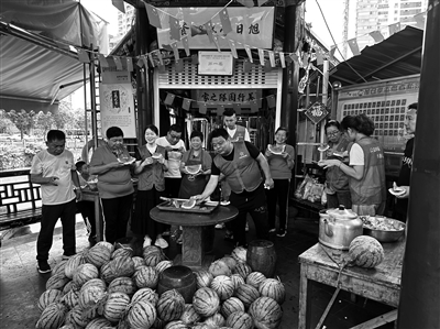 随后,公益团队一路驱车来到位于市区矮凳桥的旭日亭,旭日亭的义工队有53名成员,每天服务的人数超过300人。西瓜车刚到,旭日亭的负责人就说:“太好了,最近天气炎热,谢谢你们送的爱心西瓜。这份‘清凉的爱心瓜’送得非常及时。”