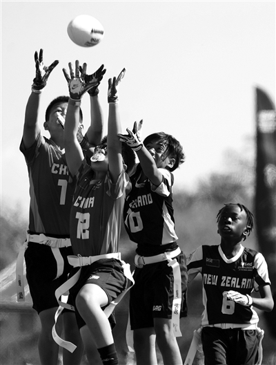NFL Flag青少年腰旗橄榄球国际锦标赛2月2日至4日在美国佛罗里达州奥兰多举行。腰旗橄榄球将亮相2028年洛杉矶奥运会,这是该项目首次被列为奥运会比赛项目。图为2月3日,中国队球员方梓渊(中)、马予泽(左)在与新西兰队的四分之一决赛中拼抢。最终,中国队13比0战胜新西兰队。