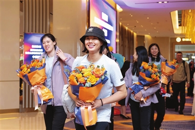 5月21日,中国国家女子排球队抵达澳门,参加5月28日至6月2日在澳门银河综艺馆举行的2024世界女排联赛澳门站赛事。图为中国女排队员龚翔宇(左二)、李盈莹(左一)在欢迎仪式上。 新华社记者 张金加摄
