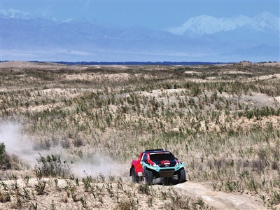 5月21日,2024中国环塔国际拉力赛在新疆喀什地区完成第一赛段比赛。赛段起点位于英吉沙县,终点设在岳普湖县,全长150.66公里,包括河床、戈壁、雅丹、沙地等多种地形。图为车手吴琦会、领航员张露驾驶车辆在比赛中。 新华社记者 张啸诚摄