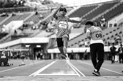 杨林锋站在跑道尽头的沙坑前,安静的体育场里回响着他有节奏的指令。在他对面,陈世昌伴着指令开始助跑,全力向前冲刺,临到起跳点时杨林锋侧身闪开,随后陈世昌一跃而起落在沙坑里。场内顿时爆发出惊叹、欢呼和此起彼伏的掌声。