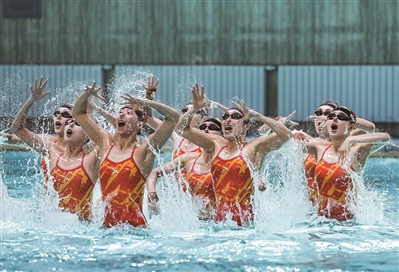 中国花样游泳队日前在北京木樨园体校游泳馆内精雕细琢每一个动作,备战巴黎奥运会。图为中国花样游泳队在训练中。本报记者安灵均摄