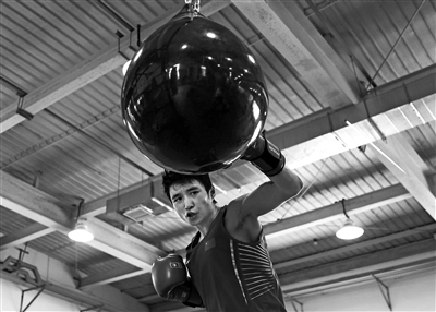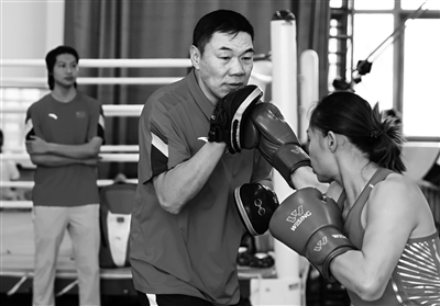 国家拳击队教练员赵勇(中)带领常园(右)在实战训练前热身。