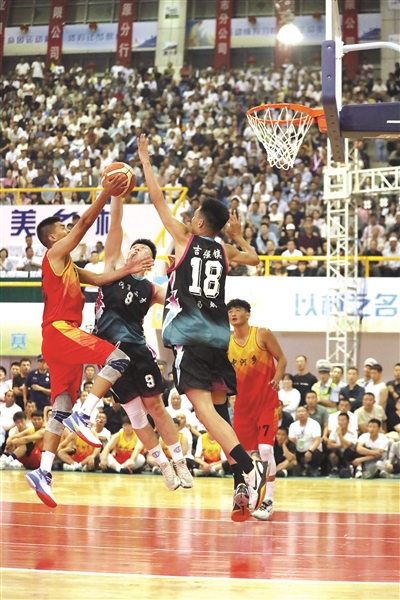 陕甘宁蒙革命老区农民篮球邀请赛暨固原市和美乡村农民篮球大赛(村BA)在宁夏固原市开展。图为西吉县吉强镇队球员在比赛中封盖对手投篮。 新华社记者 吕泽摄