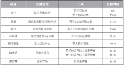 当天的南巴黎竞技场将成为关注的焦点。举重、乒乓球、女排等比赛备受关注。在南巴黎竞技场6号馆,中国举重队将全力争夺两枚金牌。首先是当天下午开始的女子59公斤级比赛,中国选手罗诗芳参赛。之后是晚上进行的男子73公斤级比赛,老将石智勇将向他的奥运三连冠发起冲击。