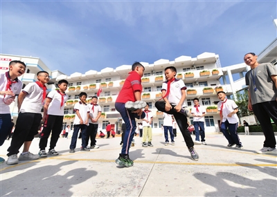 近年来,广西梧州市积极推进民族传统体育进校园,将抛绣球、打陀螺、斗驹、板鞋竞速等数十种项目引入学校,在提升学生身体素质的同时,促进各民族青少年之间的交流。图为学生们在体育大课间进行斗驹比赛。