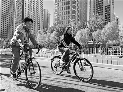 11月5日中午,温暖的阳光照耀在海河两岸,路两侧的树叶也变成了金黄色,很多市民和游客来到蓝丝带自行车骑行道骑行。
