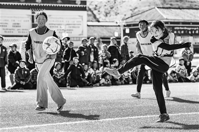 足球为高原上的女孩们打开了一扇大门。小“卓玛”们正用汗水浇灌着足球梦想,如高原上的格桑花般坚韧,迎风绽放。图为红星女子足球队队员达瓦卓玛(右一)在校园足球班级联赛中射门。新华社记者 王曦摄
