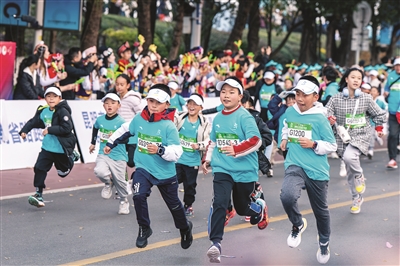近日,2024上合昆明马拉松在云南昆明滇池湖畔的海埂会堂前鸣枪开跑。图为参加亲子跑的选手在比赛中。 新华社记者 胡超摄