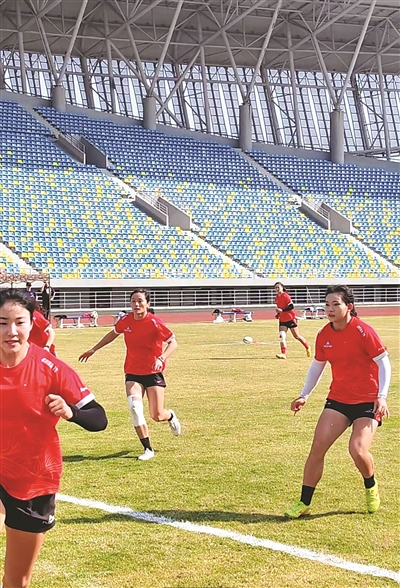体能训练接近尾声,而张乐作为新队员并没有就此结束训练。在角落里,她拿着橄榄球和教练陆专探讨着传球技术动作,在教练的示范下做出相应的练习。“一开始我也不会这样,非常被动。陆导找我谈话,告诉我橄榄球是需要交流的,自己闷着是没办法进步的。”结合橄榄球这项团队运动的特点,她变得积极主动起来,不仅向教练主动请教,还会向师姐们进行交流学习。“橄榄球比赛节奏很快,需要我们彼此熟悉,有默契,会配合,所以我必须在训练时多和大家沟通,在比赛中才能更顺畅。”张乐补充道。