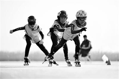 1月19日,2024-2025全国速度滑冰马拉松系列赛(宁夏站)比赛在宁夏银川市阅海滑雪(滑冰)场开赛。图为参赛选手在青少年乙组男女混合4000米追逐赛中。