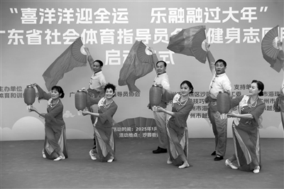 本报讯 1月19日,“喜洋洋迎全运,乐融融过大年”2025年广东省社会体育指导员全民健身志愿服务活动启动仪式在广州市海珠区沙园街道健身广场举行。由省、市、区和街道有关单位组织的10多支健身队以健身项目展演的形式参与到活动中。