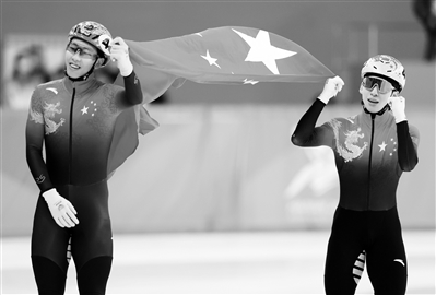 林孝埈、孙龙高高举起五星红旗,绕场挥手。尽管第四个冲线,但孙龙为这枚金牌保驾护航拼尽全力,同样功不可没。中国短道速滑队其余队员则站在场地边一起欢庆夺冠时刻。