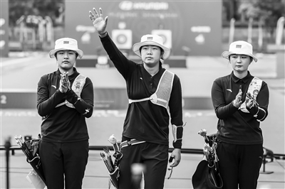 面对射箭传统强队、老对手韩国队,小将黄雨薇、朱静怡都能摆正心态,全力以赴。黄雨薇认为做好自己才是关键,“我不会把韩国队当做我追逐的目标,只需要做好自己手中的每一支箭,他们能做到的,我也能做到。”而朱静怡坦言:“遇到韩国队,我们不惧怕,她们不是不可战胜的。我们不怕输,也敢赢。”值得一提的是,奥运历史上首个射箭项目三冠王(女子个人、女子团体、混合团体)、韩国名将安山和朱静怡的动作风格十分相似,她是朱静怡心中的偶像。在世界杯上海站时,朱静怡得以和偶像同台竞技、近距离沟通交流,学到了不少“干货”。