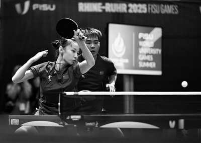 当地时间7月21日,在德国埃森举行的2025年莱茵-鲁尔世界大学生夏季运动会乒乓球混双四分之一决赛中,中国组合曾蓓勋/韩菲儿4比3战胜中国台北组合冯翊新/蔡昀恩,晋级半决赛。图为曾蓓勋/韩菲儿(左)在比赛中。新华社记者 连漪摄