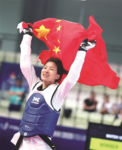 当地时间7月22日,在2025年德国莱茵-鲁尔世界大学生夏季运动会跆拳道女子53公斤级决赛中,中国选手郭清2比1战胜泰国选手宗功拉达那瓦达那,夺得冠军。图为郭清夺冠后庆祝。