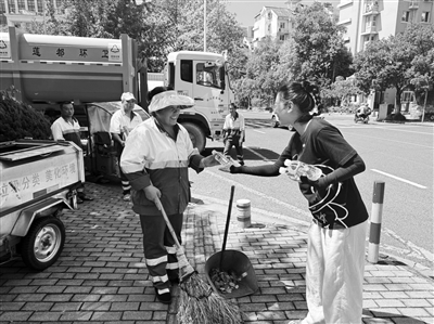 活动当天,丽水市区南明湖畔,丽水体彩和老白帮忙团的工作人员以及小学生志愿者们齐聚一堂。他们将一瓶瓶矿泉水送到外卖员、快递员和环卫工人手中,感谢他们为城市的美丽付出的辛勤努力。