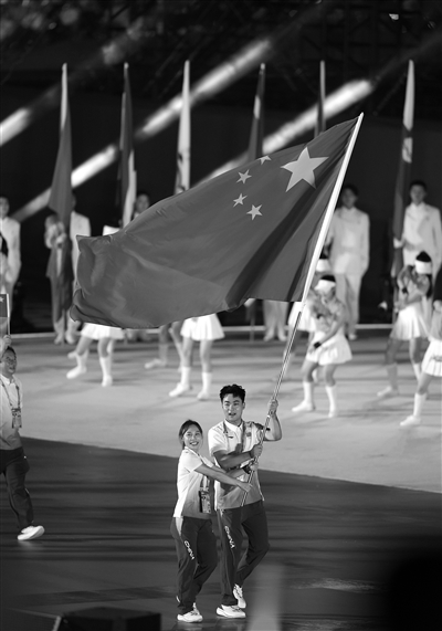 中国体育代表团旗手郭丹(左)与史经纬在开幕式上入场。  新华社记者 江宏景摄