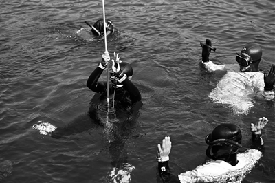 8月21日,2025年中国自由潜水全能公开赛在江苏盱眙象山国家矿山(地质)公园开赛。图为参赛选手(中)在比赛后向裁判示意。 新华社记者 季春鹏摄