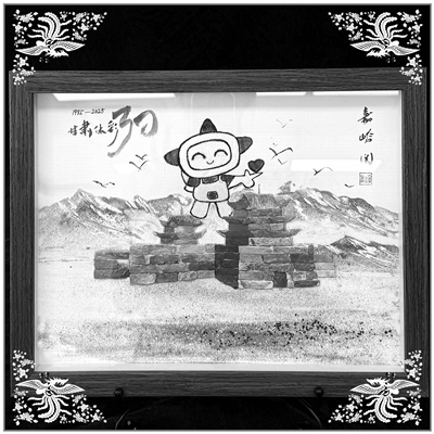 采天然风雨砺石,融大漠长城风骨。嘉峪关大漠风雨雕石艺画承袭中国古代“石材拼图”技艺,工匠以石为笔,勾勒祁连山脉的壮阔连绵。体彩吉祥物乐小星、绵延山峦与体彩标识,在一沙一石的手工镶嵌中交相辉映。每一颗石子,都成为甘肃体彩三十年公益长路的见证。